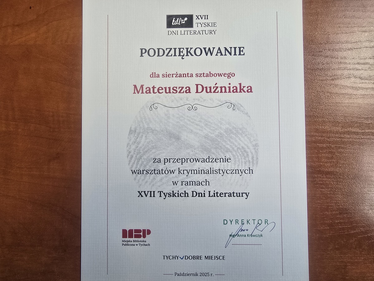 Do Komendy Miejskiej Policji w Tychach nadesłano podziękowania za udział w warsztatach kryminalistycznych w ramach XVII Tyskich Dni Literatury.