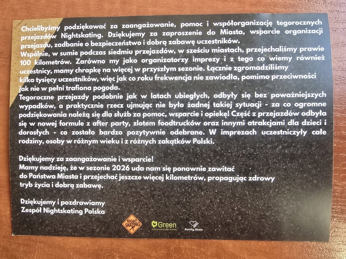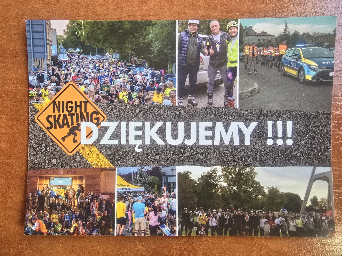 Do Komendy Miejskiej Policji w Tychach nadesłano podziękowania za pomoc w organizacji tegorocznych przejazdów Nightskating.
