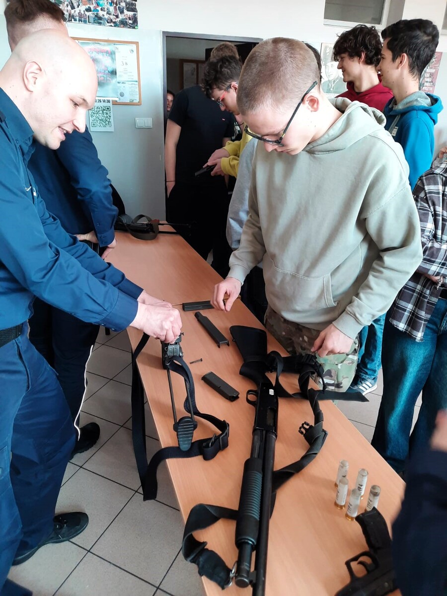 Dużym zainteresowaniem cieszyła się część praktyczna zajęć. Pod okiem policjantów uczniowie mieli możliwość zapoznania się z prezentowanymi jednostkami broni, zobaczenia sposobu ich rozkładania i składania oraz zadawania pytań dotyczących ich działania. Wielu uczestników wykazało się także dużą wiedzą na temat budowy i zasad funkcjonowania broni palnej.