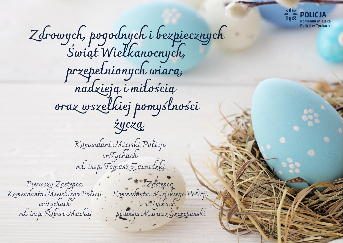 Z okazji nadchodzących Świąt Wielkanocnych Komendant Miejski Policji mł. insp. Tomasz Zawadzki w imieniu własnym i kierownictwa tyskiej Policji składa wszystkim życzenia zdrowych, pogodnych i bezpiecznych Świąt Wielkanocnych przepełnionych wiarą, nadzieją i miłością oraz wszelkiej pomyślności.