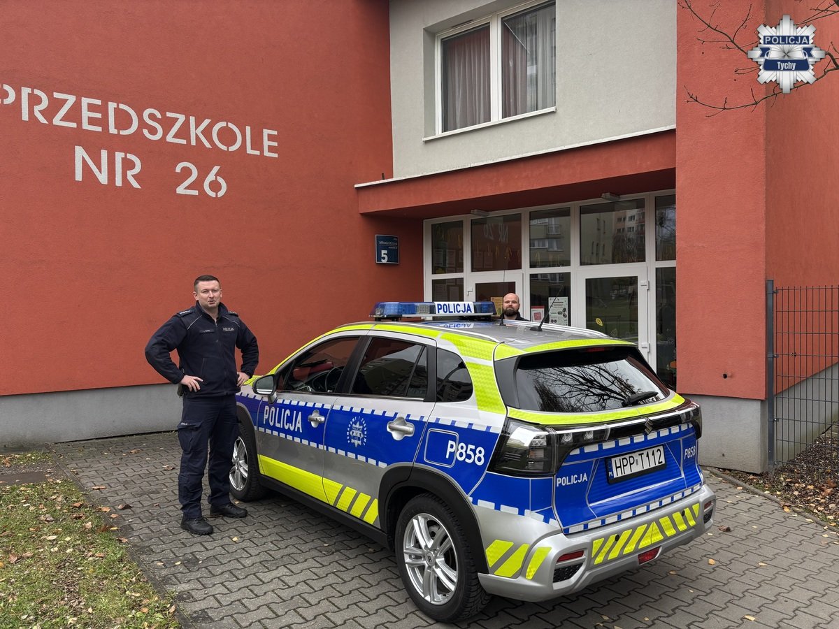 Funkcjonariusze rewiru dzielnicowych Komendy Miejskiej Policji w Tychach, asp. Artur Dzida oraz st. sierż. Witold Młynarski odwiedzili Przedszkole nr 26 w Tychach, aby porozmawiać z najmłodszymi o bezpieczeństwie.