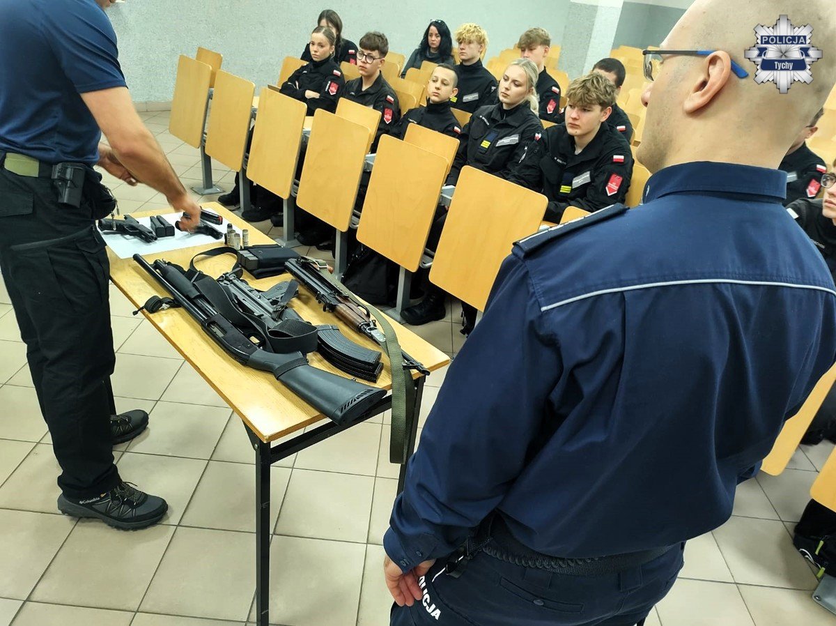 Wczoraj, 6 listopada w Zespole Szkół im. Orląt Lwowskich w Tychach odbyły się zajęcia prowadzone przez policjantów z Komendy Miejskiej Policji w Tychach. W spotkaniu uczestniczyli uczniowie klas mundurowych, którzy mieli okazję zobaczyć oraz zapoznać się z bronią znajdującą się na wyposażeniu policji.