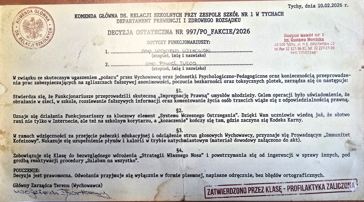 Do Komendy Miejskiej Policji w Tychach nadesłano podziękowania dla policjantów z Zespołu ds. Profilaktyki Społecznej, Nieletnich i Patologii Wydziału Prewencji.